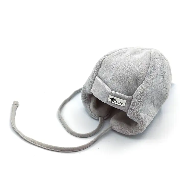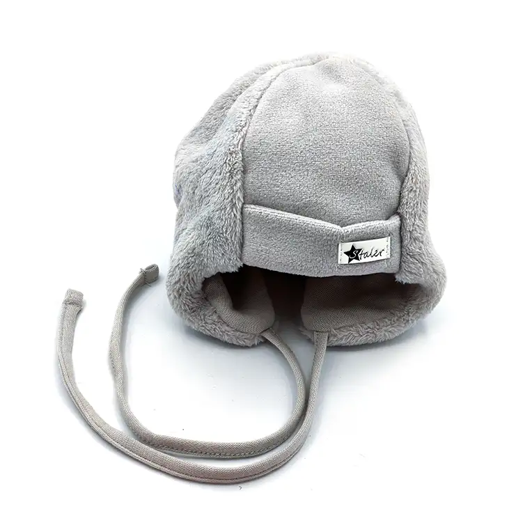 Gorro infantil polar gris con orejeras y cintas. Marca Sterntaler, fabricado en Alemania.