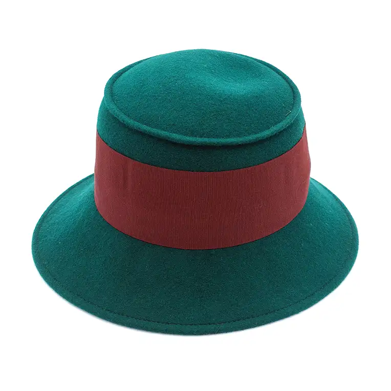 Sombrero italiano Marone en fieltro y lana. Verde esmeralda con lazo en burdeos, mostaza y violeta.
